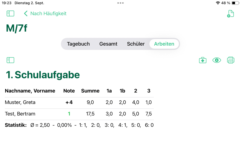 Mit EduDiary kannst du auch deine Arbeiten auswerten.