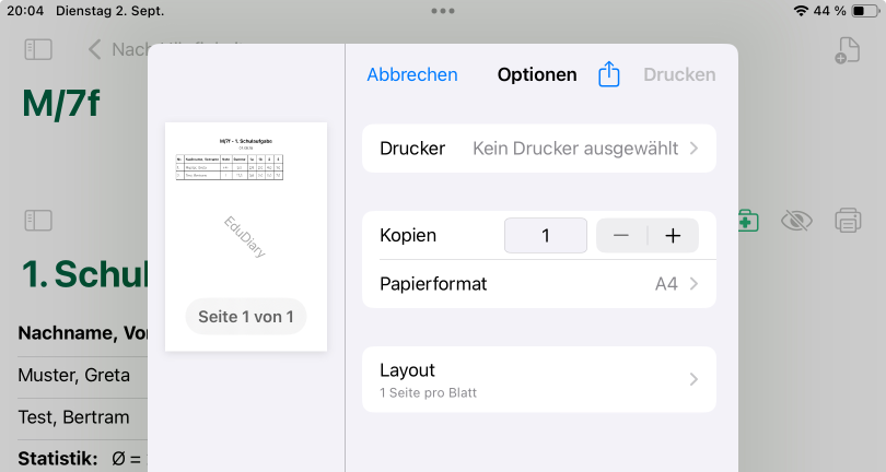 Wenn du Drucken möchtest, nutze die entsprechende Schaltfläche rechts oben. Daraufhin öffnet sich der Drucken-Dialog und du kannst es auf einem Drucker deiner Wahl ausgeben.