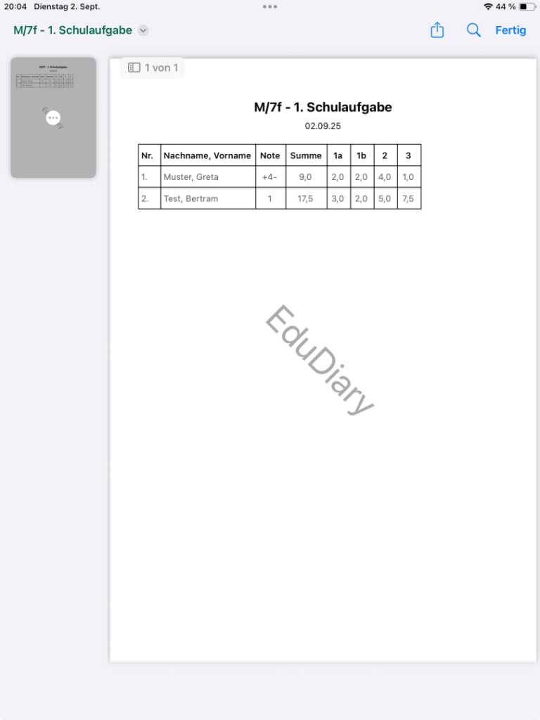 Alternativ kannst du das Vorschaubild (links) mit zwei Fingern groß ziehen, um eine pdf-Datei zu erstellen. Diese kannst du teilen oder in Dateien ablegen.