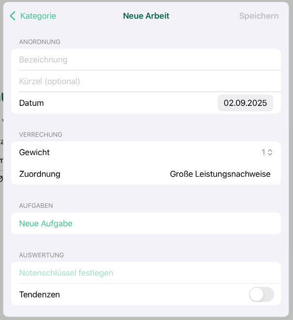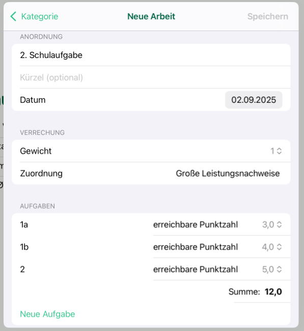 Deine Arbeit benötigt eine Bezeichnung (z.B. 1. Schulaufgabe). Außerdem musst du ein Datum angeben. Das Gewicht lässt sich ebenfalls verändern.