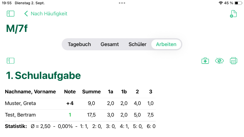 Die Noten einer Arbeit werden erst dann in der Gesamt- oder Schüleransicht sichtbar, wenn du dies möchtest. Verwende hierzu das Augensymbol.