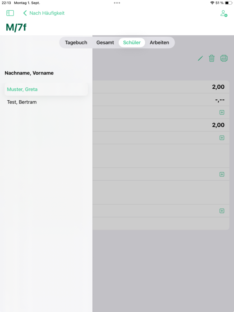 Wenn du das Symbol über dem Namen des aktuellen Schülers berührst, kannst du aus der Liste aller Schülerinnen und Schüler des aktuellen Unterrichts einen anderen auswählen.