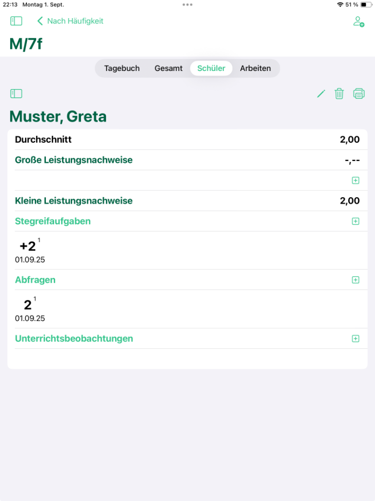 In der Schüleransicht siehst du alle Noten des aktuell gewählten Schülers. Zusätzlich zur Gesamtansicht siehst du aber auch, an welchem Datum die Noten vergeben wurden.
