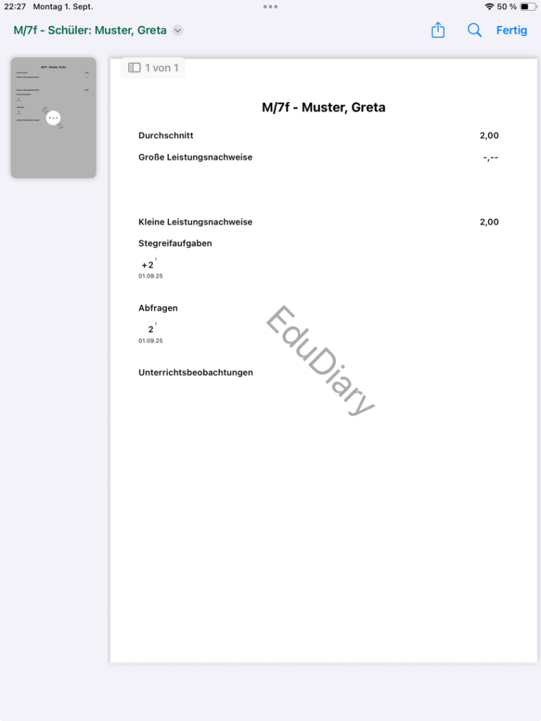 Alternativ kannst du das Vorschaubild (links) mit zwei Fingern groß ziehen, um eine pdf-Datei zu erstellen. Diese kannst du teilen oder in Dateien ablegen.