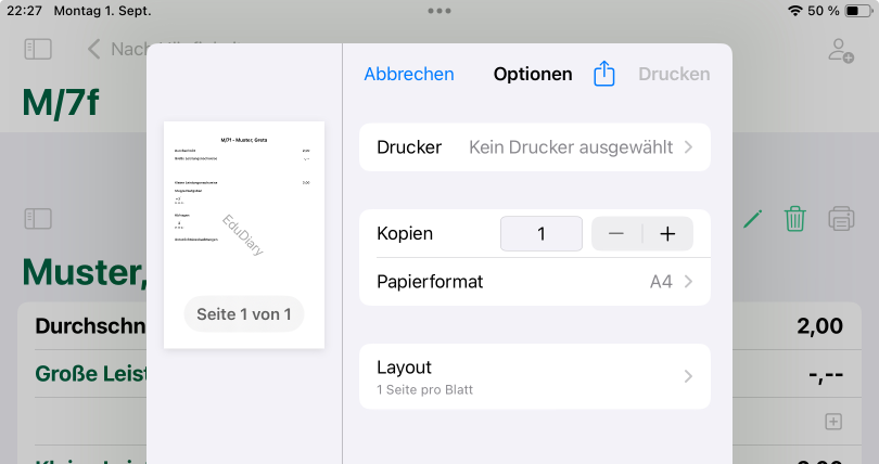 Wenn du Drucken möchtest, nutze die entsprechende Schaltfläche rechts oben. Daraufhin öffnet sich der Drucken-Dialog und du kannst es auf einem Drucker deiner Wahl ausgeben.